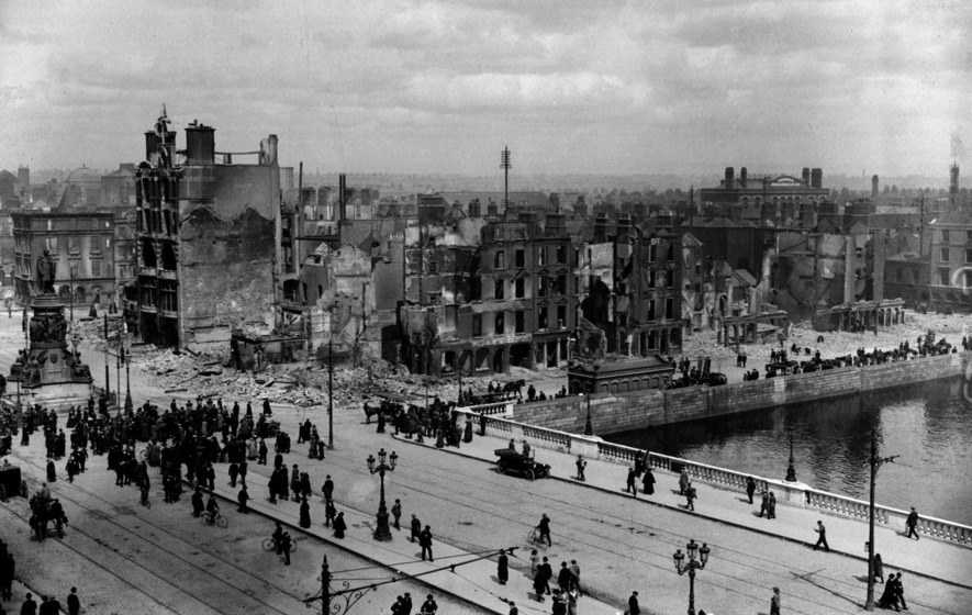 Extrait du film « Michael Collins », sorti en 1996, montrant la capitulation des insurgés de la poste centrale de Dublin en 1916 :