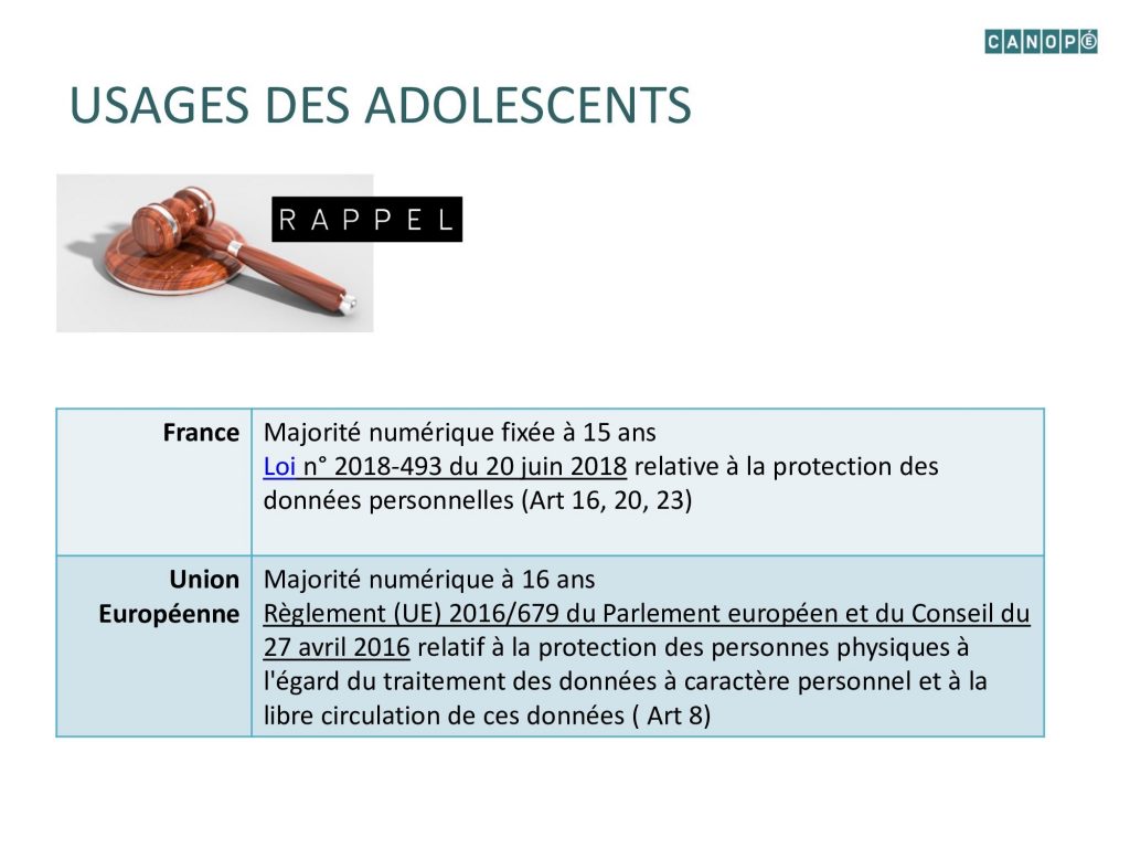 - La loi américaine qui régit les principaux réseaux sociaux interdit la collecte de données avant 13 ans. Il est donc interdit de s’inscrire avant cet âge. Entre 13 et 15 ans, l’ouverture d’un compte est soumise à l’autorisation et la responsabilité d’un adulte. Après 15 ans, l’ouverture d’un compte est autorisée.