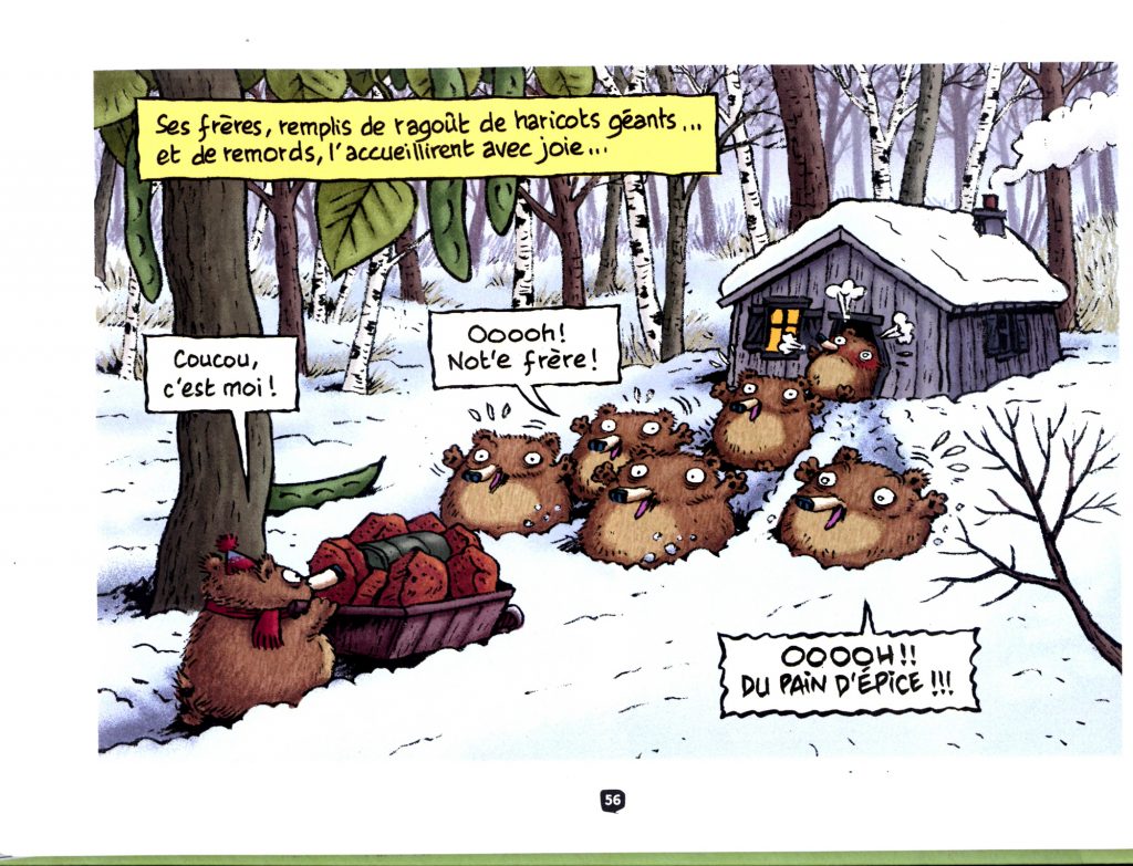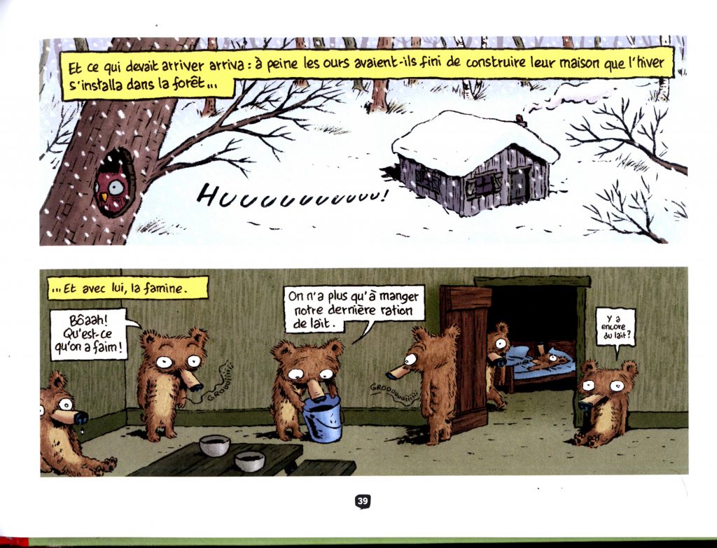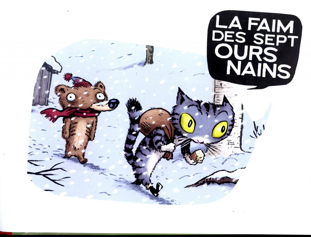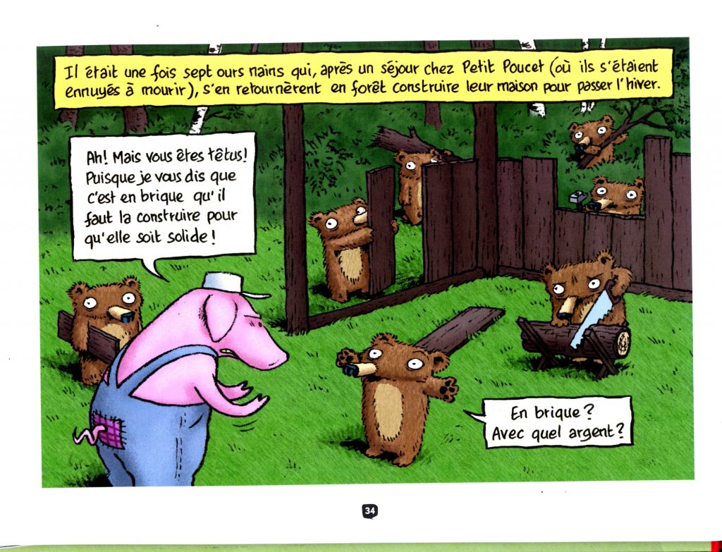 Une vision désenchantée : Emile Bravo torture le côté magique et merveilleux du conte. Les sept ours nains, héros de ces contes, n’en sortent jamais complètement heureux, comme il arrive généralement à la fin des contes. Il sont logés et nourris mais s’ennuient, ont à manger mais se font voler leur or, sont condamnés au sommeil éternel devant la télévision.