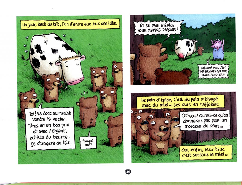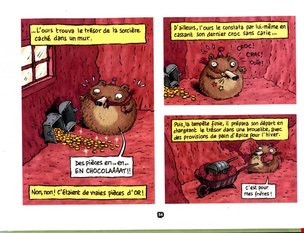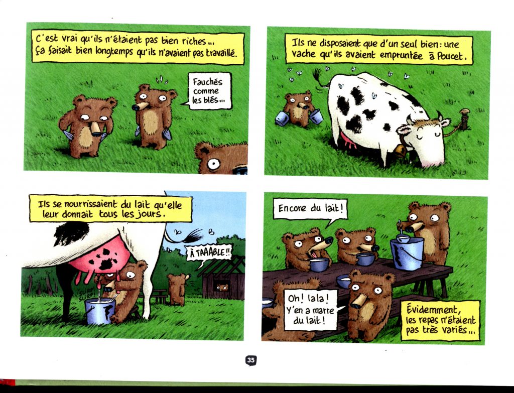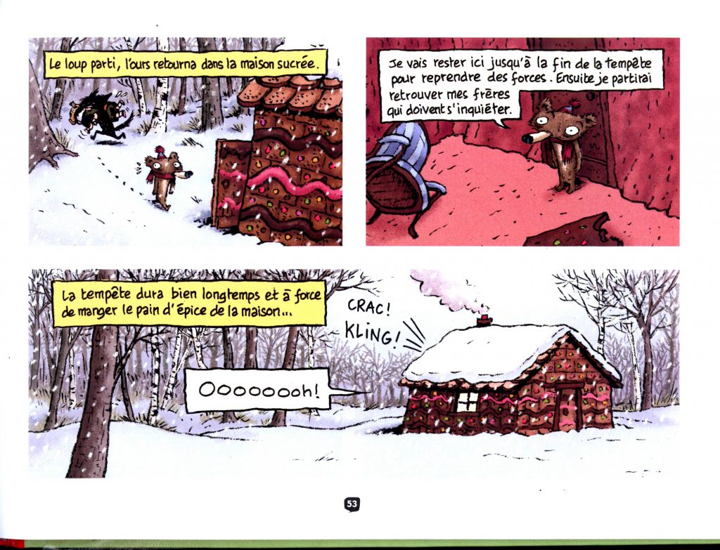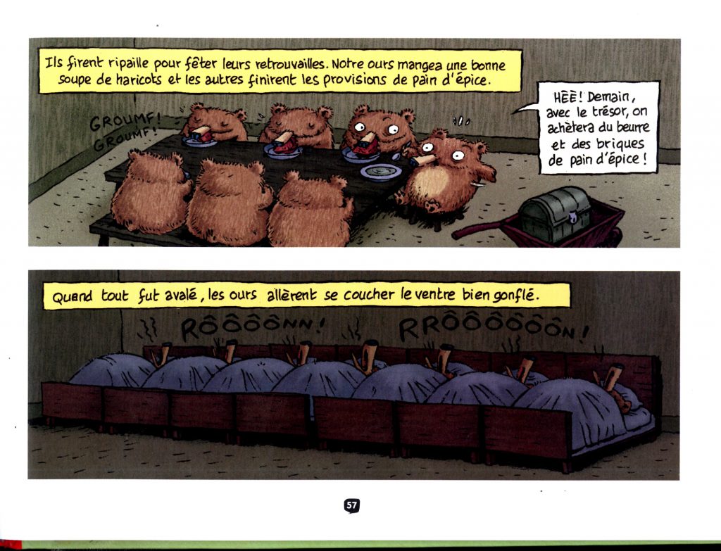 Une vision désenchantée : Emile Bravo torture le côté magique et merveilleux du conte. Les sept ours nains, héros de ces contes, n’en sortent jamais complètement heureux, comme il arrive généralement à la fin des contes. Il sont logés et nourris mais s’ennuient, ont à manger mais se font voler leur or, sont condamnés au sommeil éternel devant la télévision.