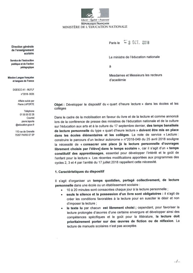 Note du MEN aux recteurs pour la promotion du Quart d’Heure Lecture à la rentrée 2019 :