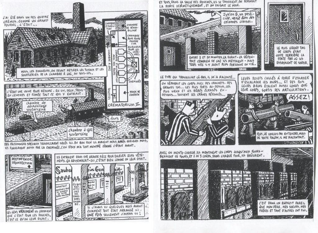 Le récit, en bandes dessinées, du quotidien de ce camp de l’horreur, inspiré de témoignages recueillis par l’auteur. Un dossier explique la genèse du projet.Le drame d’une famille juive arrêtée en 1942, et le récit de la survie de deux enfants en prison, au camp de Drancy, puis dans la clandestinité.Témoignages recueillis auprès de 800 personnes qui ont répondu à l’appel des stations de Radio France. Ces extraits de lettres, de journaux intimes et de récits autobiographiques de personnes d’origine juive qui furent enfants ou adolescents durant la Seconde Guerre mondiale, illustrent la mémoire collective de la France. Avec une chronologie.Emma est anorexique et ne parvient pas à se faire comprendre par ses parents. Mais elle trouve une écoute attentive auprès de ses grands-parents, Mamouchka et Paul qui se sont rencontrés pendant la Seconde Guerre mondiale en Allemagne. Emma devient de plus en plus maigre et découvre à la mort de sa grand-mère un terrible secret de famille.Anne Frank est née le 12 juin 1929 à Francfort. Sa famille a émigré aux Pays-Bas en 1933. À Amsterdam, elle connaît une enfance heureuse jusqu’en 1942, malgré la guerre. Le 6 juillet 1942, les Frank s’installent clandestinement dans «l’Annexe» de l’immeuble du 263, Prinsengracht. Le 4 août 1944, ils sont arrêtés sur dénonciation. Déportée à Auschwitz, puis à Bergen-Belsen, Anne meurt du typhus en février ou mars 1945, peu après sa sœur Margot. La jeune fille a tenu son journal du 12 juin 1942 au 1er août 1944, et son témoignage, connu dans le monde entier, reste l’un des plus émouvants sur la vie quotidienne d’une famille juive sous le joug nazi.Berlin 1942. Bruno a 9 ans, et vit avec ses parents et sa soeur dans une belle maison. Son père, un officier nazi, vient d’avoir une promotion et ils déménagent hors de Berlin. Bruno est triste de se retrouver loin de tout, dans une lugubre maison. De sa fenêtre, il peut voir des silhouettes d’hommes, de femmes et d’enfants, tous vêtus de pyjamas rayés. Personne ne veut lui expliquer qui ils sont.Le père de l’auteur, Vladek, Juif polonais, rescapé d’Auschwitz, raconte sa vie de 1930 à 1944, date de sa déportation. Ce récit est rapporté sous la forme d’une bande dessinée dont les personnages ont une tête d’animal : les Juifs sont des souris, les nazis des chats, les Polonais des porcs et les Américains des chiens.